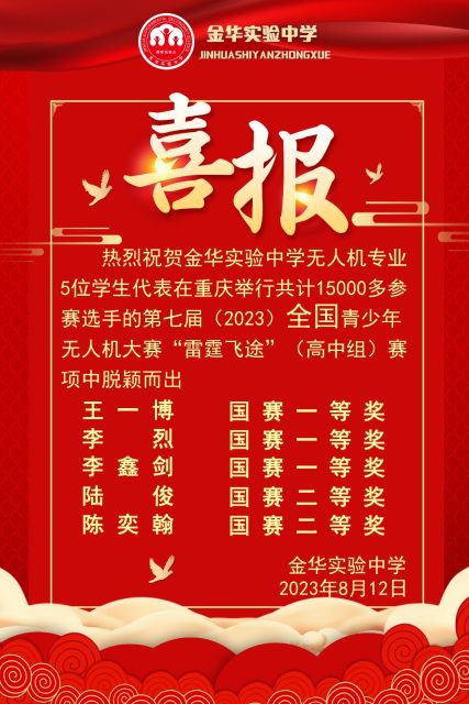 近日,第七屆全國青少年無人機大賽在重慶落幕。金華實驗中學代表隊參加高中組“雷霆飛途”項目比賽,派出的5名選手不畏強手,發揮出色,王一博、李烈、李鑫劍榮獲一等獎,陸俊、陳奕翰榮獲二等獎。