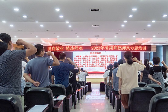 副校長(zhǎng)張雪明帶領(lǐng)全體教師宣誓。在莊嚴(yán)的宣誓儀式中,全體教師舉起右拳,莊嚴(yán)宣誓:忠誠(chéng)黨的教育事業(yè),依法履行教師職責(zé),落實(shí)立德樹(shù)人根本任務(wù)。為人師表、敬業(yè)愛(ài)生,嚴(yán)謹(jǐn)治學(xué)、潛心從教,甘為人梯、樂(lè)于奉獻(xiàn),崇德修身、廉潔自律,為黨育人、為國(guó)育才。做有理想信念、有道德情操、有扎實(shí)學(xué)識(shí)、有仁愛(ài)之心的四有好教師。錚錚誓言,鏗鏘有力,響徹了整個(gè)會(huì)場(chǎng)。
