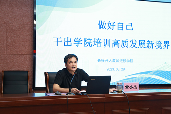 8月28日上午,全體教師認真聽取了學院院長章小杰《做好自己,干出學院培訓高質發展新境界》的專題報告,他強調在新形勢下,教師要始終以翻篇為零的姿態,做好自己,主動作為,努力為實現“辦省一流培訓學校”美好愿景、打響“學在長興”品牌和地方終身教育發展貢獻力量。