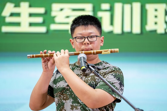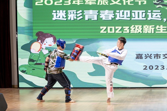 當大家還沉浸在悠揚的笛聲中時,教官現場展示威風陽剛的擒敵術,一招擒敵,干凈利落。新生也不甘落后,為大家帶來跆拳道表演,攻防轉換之間,尚武精神盡顯。