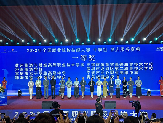 8月30日至9月4日,2023年全國職業院校技能大賽(中職組)酒店服務綜合賽項在廣州白云國際會議中心隆重開賽。寧波市北侖職業高級中學的史奇、康海濤兩位同學代表寧波市參加比賽,與來自30個省(區、市)和新疆生產建設兵團的79所職業學校的150余名選手同臺競技。經過激烈角逐,史奇、康海濤憑借過硬的基本功,嫻熟的技能,在比賽中大放異彩,獲得大賽一等獎的佳績。這是北侖職高今年獲得的第3枚國賽獎牌,也是學校標志性成果的再次重大突破!