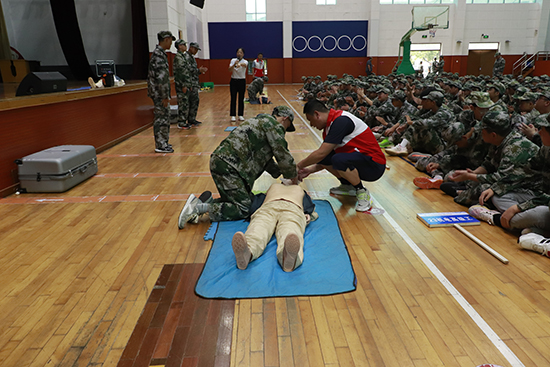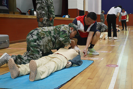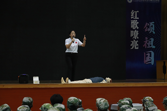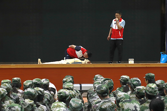 紅十字救護員老師們向同學們介紹了心搏驟停的表現(xiàn),如何判斷是否喪失意識、有無自主呼吸、有無脈搏,幫助大家判斷應(yīng)急救護的正確時機,并通過“模擬人”示范胸外按壓、清理口腔異物、開放氣道、人工呼吸等操作要領(lǐng)。講解示范后,學生代表上臺進行現(xiàn)場模擬救護的實操練習,老師們對同學們的操作手法進行了規(guī)范指導(dǎo)。