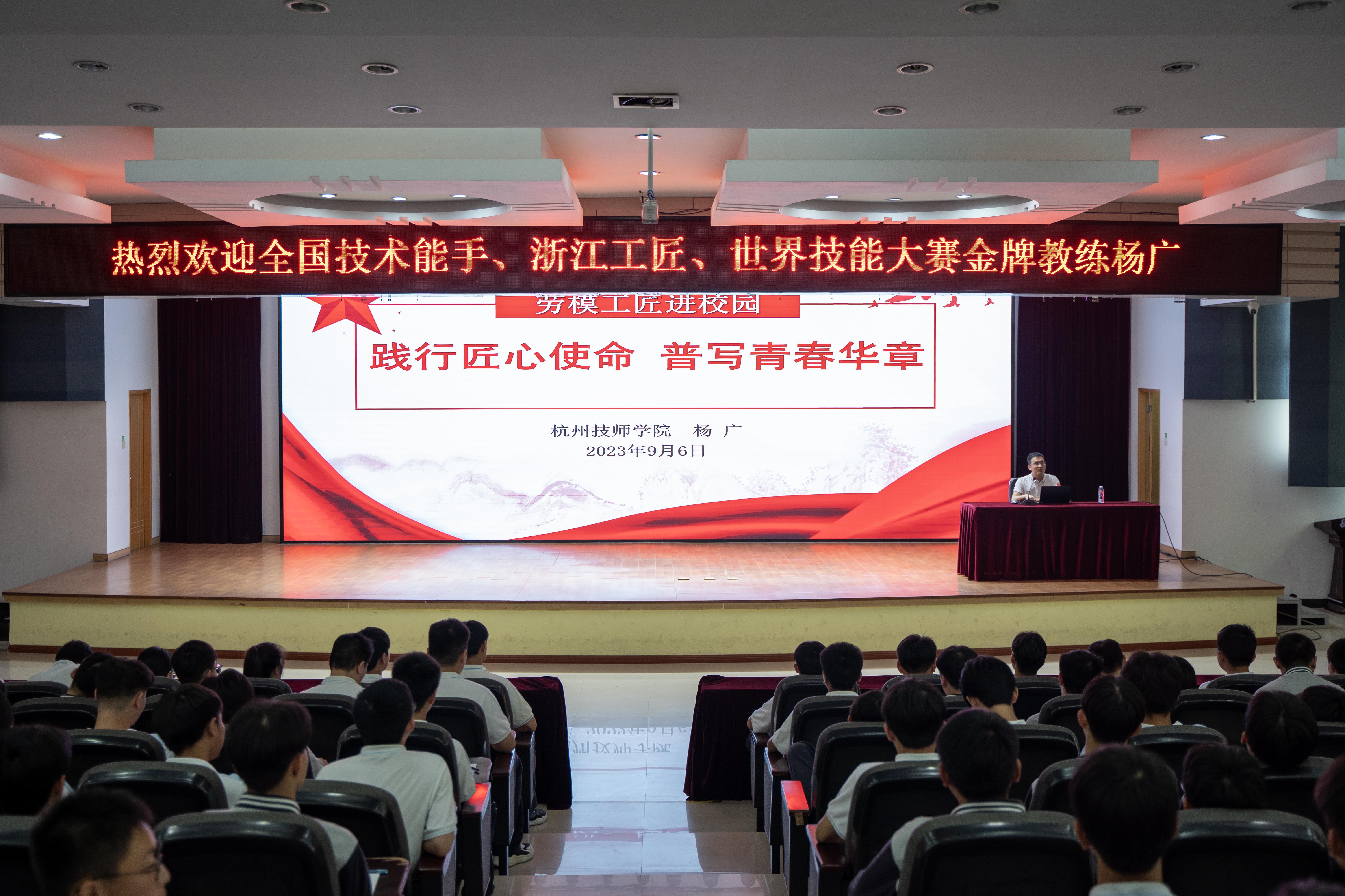 9月6日上午,嘉興市交通學校邀請全國技術能手、省級領軍人才、浙江工匠、浙江青年工匠、浙江省政府行政嘉獎、浙江省金藍領高技能人才、國家一類大賽優秀指導教師、世界技能大賽國家隊教練楊廣來校為近300名學生做報告。