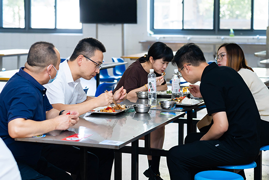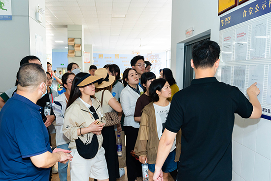 隨后,家長代表們到食堂、寢室、教室及軍訓(xùn)會操現(xiàn)場等地開展了現(xiàn)場參觀和實地考察。在食堂工作人員的帶領(lǐng)下,家長們深入了解了食堂工作的各個環(huán)節(jié),參觀了原材料儲藏間、烹飪間、操作區(qū)和售賣間等地,全方位了解了食堂供應(yīng)情況。湯方榮陪同家長及孩子們在食堂共進午餐,聽取他們對食堂的意見和建議。