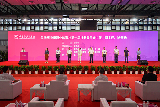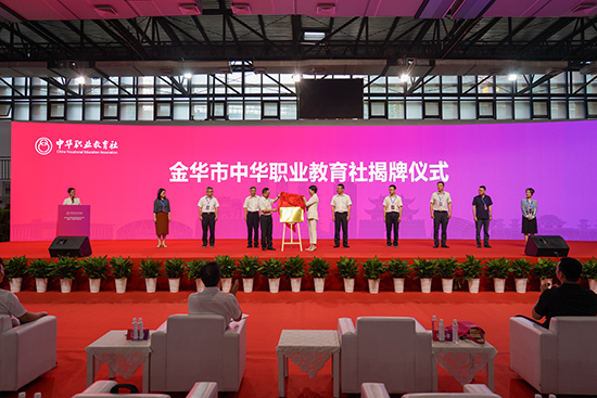 在全場熱烈的掌聲中,陳小平和胡曉杭共同為金華市中華職業教育社揭牌。