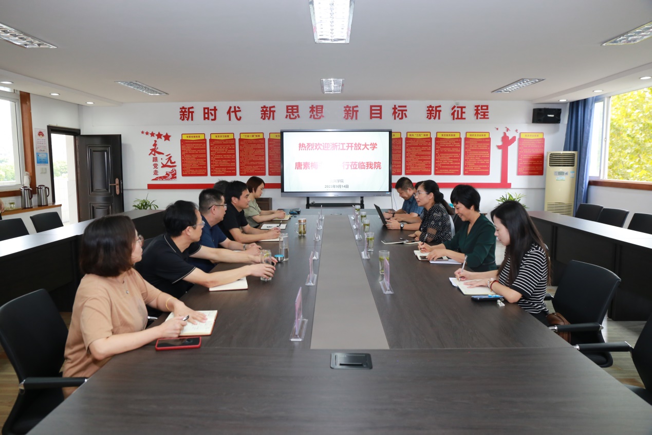 9月14日上午,浙江開放大學黨委委員、紀委書記唐素梅,紀檢監察室主任丁紅霞,信息化中心主任張翼翔一行來浙江開放大學長興學院調研,重點了解開放大學綜合改革推進情況、2023年秋季招生工作情況。湖州開大繼續教育學院副院長雷術海,繼續教育學院辦公室主任張金靜,長興學院院長章小杰,黨總支書記金曙,副書記孫甫永,副院長周金金,黨總支委員、教務處主任駱秀芳等參與調研并進行座談交流。