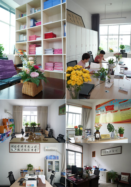 一室一風景,一室一特色。各辦公室標語的張貼,工藝畫的貼掛,辦公用品的擺放,盆栽鮮花的點綴,都頗為講究。或簡潔大方,或清新雅致,或書香濃郁,或溫馨如家……辦公于此,無論是備課、教研、改作業,都是樂事一件!
