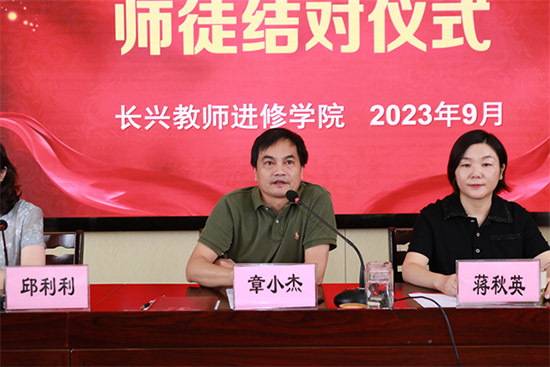 長興教師進修學院院長章小杰對基地學校和導師的無私付出表示感謝。同時針對新教師提出了三點期待:第一,期待新教師能構建美好的職業發展規劃;第二,期待新教師能形成正確的教育教學觀;第三,期待新教師能樹立正確的學習觀。針對導師提出了兩點希望:第一,希望導師在帶教途中做到傾囊相授、嚴慈相濟;第二,希望導師在帶教途中做到教學相長、相互成就。章院長認為師徒結對是一份托付,是一種傳承,是“青出于藍勝于藍”的堅持與追求。