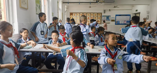 孩子們通過玩轉竹飛輪,親身感受到竹玩具的魅力與用途。耿老師耐心指導每位學生,并邀請毛其娟與學生一起玩轉竹飛輪,在加深師生感情的過程中,讓學生體驗玩具的新鮮感與快樂。