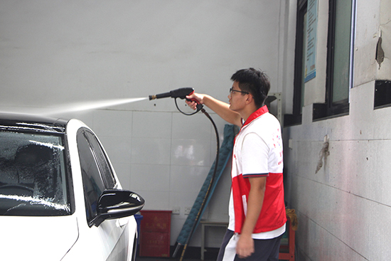 汽車美容中心社團的同學們面向社會,高質量完成了一場技能展示活動——免費洗車志愿服務活動。現場前來洗車的車輛絡繹不絕,志愿者經過前期培訓,動作十分嫻熟仔細,整個洗車程序分工明確,有條不紊。當天,志愿者們結合自身所學專業,用平凡樸實的行動,讓汽車除垢換新,共清洗四十余輛汽車。一輛輛汽車在陽光下光彩奪目、煥然一新,贏得車主一陣好評。
