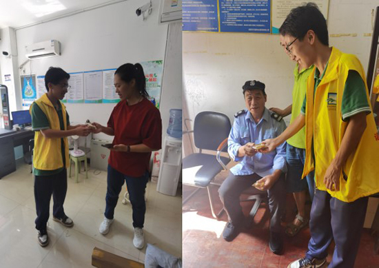 最后,在社區工作人員和網格員的陪同下,志愿者們帶著做好的冰皮月餅,給社區菜鳥驛站的工作人員和門衛保安師傅送上中秋溫暖。保安師傅收到月餅,高興得合不攏嘴。“節日還不忘給我送月餅,感謝你們的惦記!”