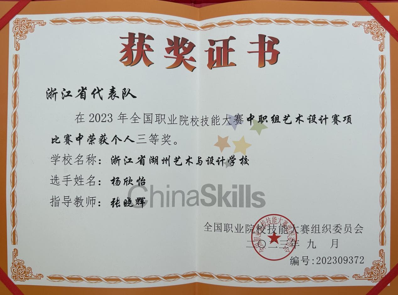 9月19日—9月22日,2023年全國職業院校技能大賽中職藝術設計賽項在武漢市第二職業教育中心學校舉行。浙江省湖州藝術與設計學校團隊(選手:楊欣怡,輔導老師:張曉輝,協助:楊婧,領隊:費永軍副校長)赴武漢參加比賽。此次比賽共有來自全國各省市自治區、計劃單列市的73支參賽隊,藝校選手楊欣怡突破重重困難榮獲三等獎,這也是藝校在職業技能大賽數年蟄伏后的首次亮相。
