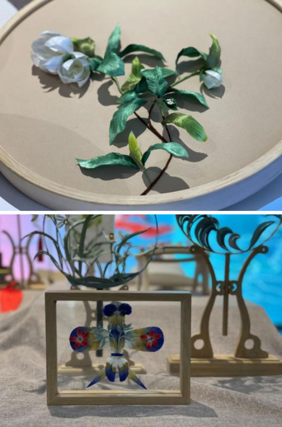 此次非遺類作品以纏花、絨花為主要展品。纏花全名為英山纏花,源于明代,盛于清代,距今已經有600年歷史,是我們國家的一項非物質文化遺產,有著重要的文化價值。其特點為“小”“巧”“精”“活”。人們稱它是“立體繡花”“線藝雕塑”“立體工筆畫”。纏花為線的藝術,制作時需耐心與技巧的加持,方能體會纏花的魅力。