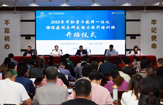 10月13日下午,2023年中職骨干教師一體化課程建設(shè)與研發(fā)能力提升培訓(xùn)班開(kāi)班儀式在紹興市上虞區(qū)職業(yè)中等專(zhuān)業(yè)學(xué)校隆重舉行。浙江萬(wàn)里學(xué)院繼續(xù)教育院院長(zhǎng)楊文杰、紹興市上虞區(qū)教體局職成科科長(zhǎng)汪月忠、上虞區(qū)職業(yè)中等專(zhuān)業(yè)學(xué)校校長(zhǎng)鄭利榮、上虞區(qū)職業(yè)教育中心副校長(zhǎng)許葉鋒出席儀式,上虞區(qū)內(nèi)61位專(zhuān)業(yè)課高級(jí)教師參加培訓(xùn)。開(kāi)班儀式由上虞區(qū)教師發(fā)展中心副主任張彩君主持。