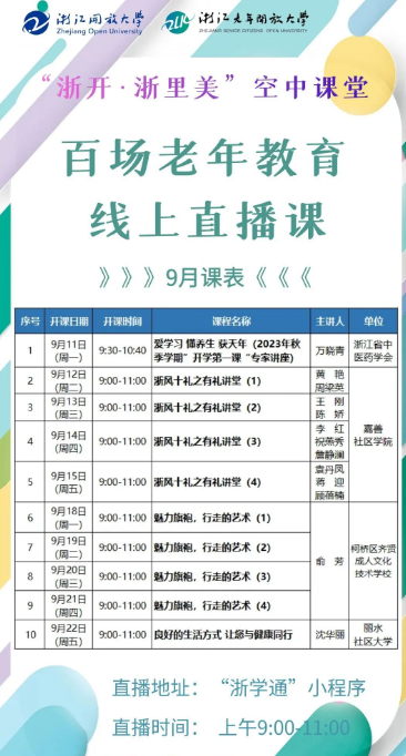 為深入貫徹落實黨的二十大精神、進一步推進社區教育進農村文化禮堂,“浙開·浙里美”空中課堂適時推出直播課程。通過應用“浙學通”小程序,幫助老人線上學習空中課堂的公益課程,不僅讓老年人遠離“技術的冰冷”感到“人情的溫度”,共享現代社會信息化成果,更讓老年人學會通過網絡課堂相聚“云端”,足不出戶享受優質的老年教育資源,樂享文化養老。