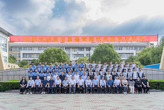 最后,若爾蓋縣黨政代表團、嘉興平湖兩地相關單位領導在校門口與若爾蓋學生們共同合影。(徐登峰/文 楊磊/圖)