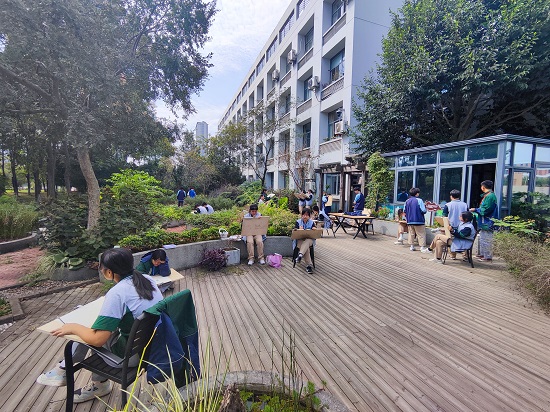 在寫生比賽現(xiàn)場,只見選手們看著眼前的美景與建筑,不一會兒便勾勒出了校園里的花草樹木、建筑。這是他們心中的信校秋景圖,訴說著信校的美麗與內(nèi)涵,更訴說著對信校家園的情感。