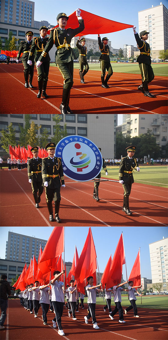 伴隨著雄壯的《運(yùn)動(dòng)員進(jìn)行曲》,在國旗隊(duì)、會(huì)徽隊(duì)和紅旗隊(duì)的引領(lǐng)下,全院46個(gè)班級(jí)的運(yùn)動(dòng)方隊(duì)英姿颯爽、精神飽滿地有序入場(chǎng),走向主席臺(tái)接受檢閱。整齊劃一的步伐、精準(zhǔn)有力的動(dòng)作、嘹亮激情的口號(hào)、別出心裁的展示,盡顯學(xué)院學(xué)子蓬勃向上的精神面貌!