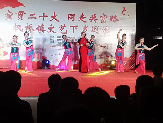 10月17日晚,諸暨市楓橋鎮樓家村搭起了一個舞臺,裝飾一新,場上燈光通明,臺前陸續坐滿了村民,“楓橋鎮‘宣貫二十大 同走共富路’送戲下鄉文藝巡演”來到了這里演出。