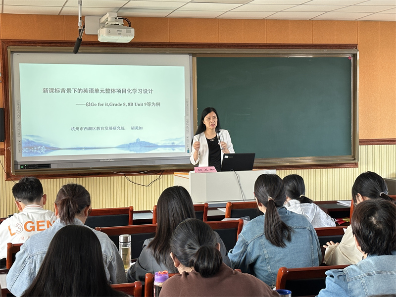 杭州市西湖教育發展研究院研究員、浙江省教育學分會常務理事胡美如作專題講座《新課標背景下的初中英語單元整體項目化學習設計》。胡老師從2022年新頒布的義務教育新課標的視域出發,簡述初中英語單元整體項目化學習的理論、項目化學習設計的要素和逆向學習設計等,并以人教版8B Unit 9為例,具體講述如何通過設計單元整體大項目、設計大項目評估量規、設計子項目排序學習和設計單元整體性評價四個維度提升英語單元整體專業化教學。