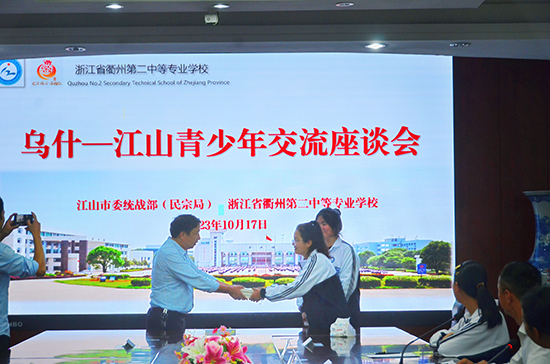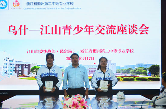 10月17日下午,江山市委統戰部副部長、民宗局局長王向明一行來到衢州第二中等專業學??赐麃碜詾跏部h職業技術學校的三名師生,并舉行烏什——江山青少年交流座談會。