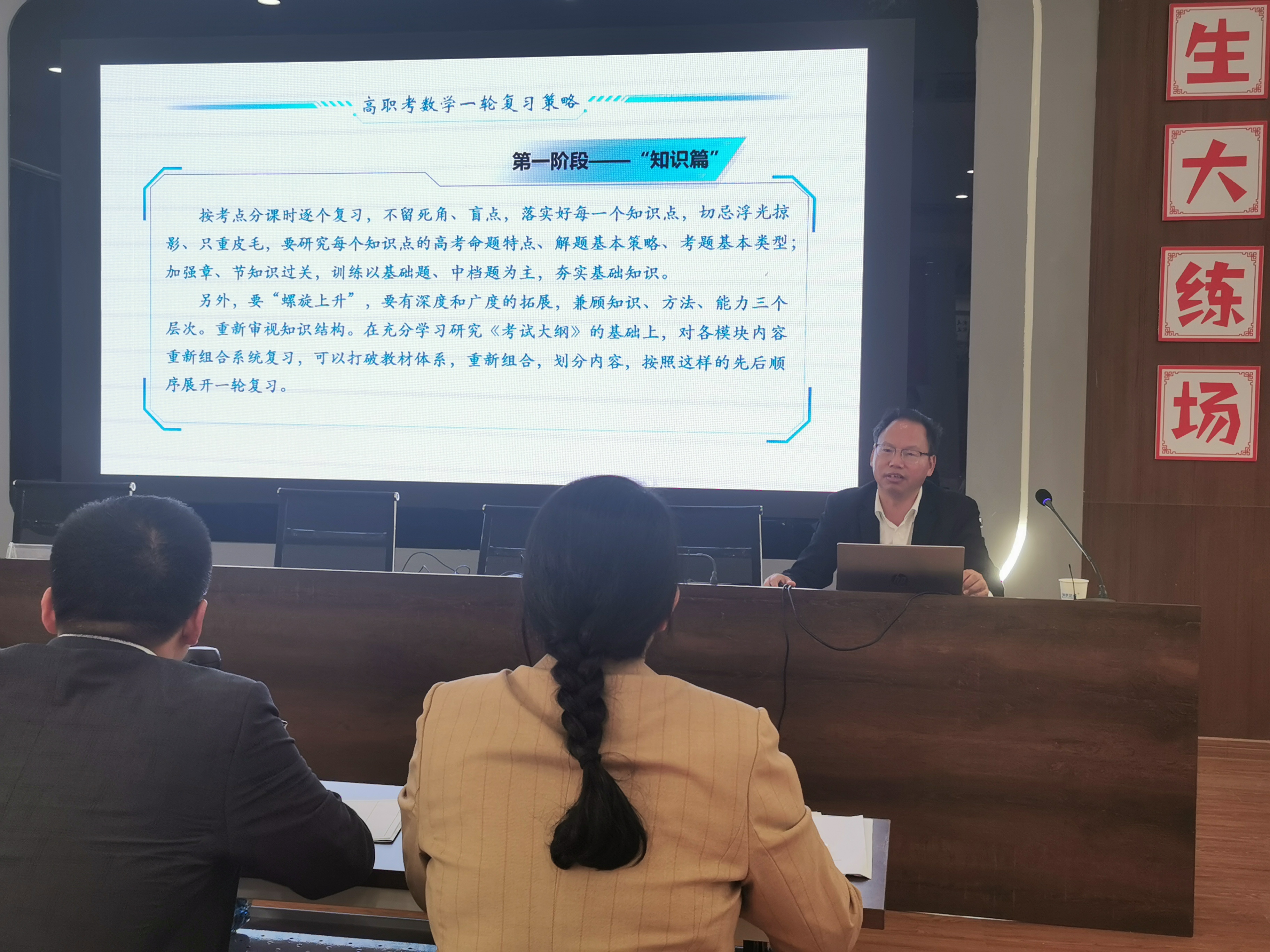 省網絡名師工作室領銜人、衢州中等專業學校傅欽志老師做《高職考數學有效復習策略》的專題講座,主要就一輪復習中的第一階段“知識篇”展開。他指出,一輪復習要按考點、分課時逐個復習,不留死角與盲點,重在夯實基礎。另外,要“螺旋上升”,有深度的挖掘和廣度的拓展,兼顧知識、方法、能力三個層次,從而增強高職考復習成效。