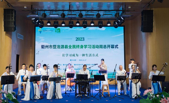 本次開幕式活動形式多樣、豐富多彩,充滿地方元素特色。有龍游縣社區學院選送的民樂合奏《撥根蘆柴花》、柳園小學的婺劇《別洞觀景》、模環鄉社區學校的道情說唱《家鄉的變化》、實驗幼兒園的情景劇《永不消逝的電波》以及詹家鎮社區學校的畬族舞蹈《山哈一曲唱浦山》等文藝節目,來自龍游縣15個鄉鎮(街道)社區學校分管負責人共同宣讀了《全民終身學習活動倡議書》。