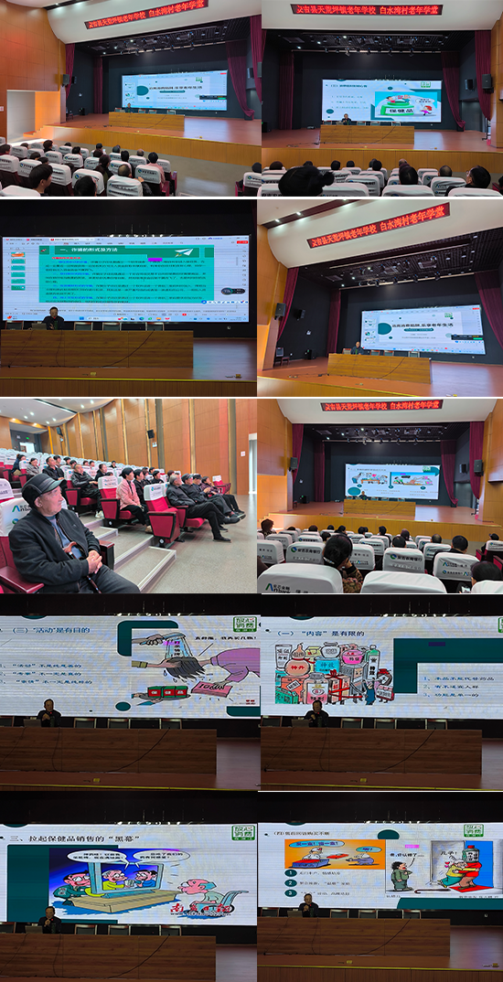 王書記首先針對老年人群體最常見的保健品騙局進行重點講解。通過分享案例,以圖文并茂的方式向老年人詳細描述了非理性購買保健食品的后果,步入保健品推銷陷阱的步驟,拉起保健品銷售的黑幕及社會共治保健類商品市場等內容。同時,結合歷年315晚會報道的相關內容,以觀看視頻的方式更加直觀地讓老年人對直播間的“騙局”有一個正確的認識,以防上當受騙。