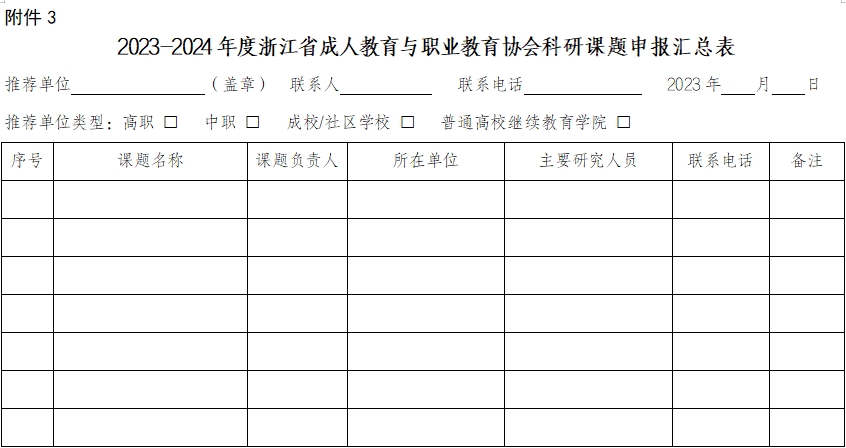 3.各單位按要求對課題申報人的個人條件和課題研究條件進行審核,并在規定時間內將課題申報表(一式二份)及申報材料匯總表(見附件3,一式一份)郵寄至浙江省成人教育與職業教育協會秘書處,同時將申報材料的電子稿(Word版和PDF版各一份)發送至協會郵箱zj_czjxh@163.com。申報材料電子文檔以“序號+主持人姓名+院校+課題名稱”命名。如申報材料無電子文檔將不予評審。