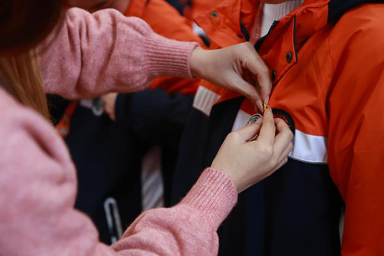 團委老師為新團員佩戴團徽。小團徽,大光輝,它將見證每一位逐夢青年的奮斗歷程。