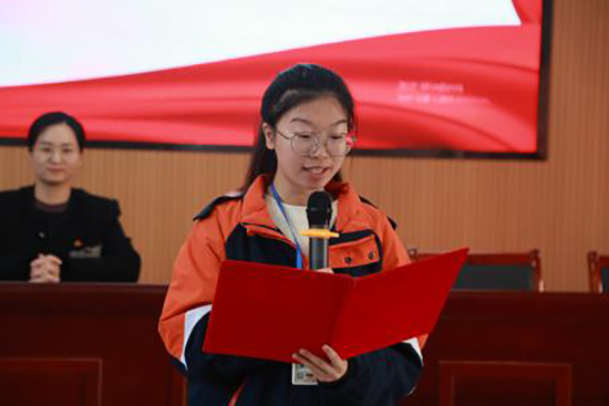 新團員代表2204班趙舒睿同學發言,她表示,中國共產主義青年團是培養和造就“四有”青年的革命熔爐,對青年有約束力,能磨礪青年使其擁有團結合作、吃苦耐勞的精神。大家在成為光榮的共青團員后,也要繼續投入到志愿服務中去。繼承發揚優良傳統,以先進青年的高標準嚴格要求自己,不斷地提高自我,完善自我,超越自我。(金曉雯)