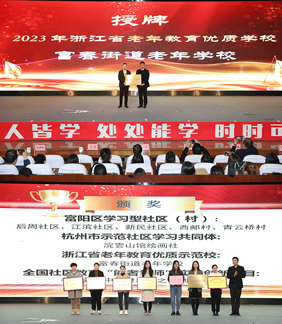 11月17日上午,2023年富春街道全民終身學習活動周啟動儀式暨富春街道老年學校成功創建浙江省老年教育優質學校慶祝大會在杭州市富陽區職教中心召開。富春街道人大工委主任盛志軍,富陽區老干部局副局長江洪,富陽區教育局教育科副科長許棋棋,富陽區社區學院副院長吳凌華,富陽區職教中心校長孫良杰,以及富春街道所屬村(社區)負責人、文化員,富春街道老年學校老師、學員參加活動。
