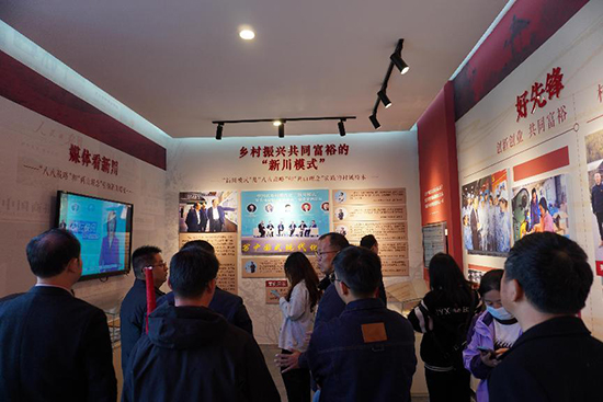 師生一行在新川村黨委委員張小強(qiáng)的引導(dǎo)下,先后參觀了鄉(xiāng)村振興案例館、誠(chéng)信館、初心館、居家養(yǎng)老服務(wù)中心等,借助照片、數(shù)據(jù)、實(shí)物和音視頻等多種宣傳媒介手段,近距離感受到了新川村與天能“村企共建”的山鄉(xiāng)巨變。老照片里的新川村曾經(jīng)高污染企業(yè)遍地開花,眼前的新川成為青山綠水富一方百姓的“世外桃源”。新川的美麗蛻變得益于村里果斷關(guān)停污染礦山,堅(jiān)決淘汰落后產(chǎn)能,堅(jiān)持走人與自然和諧共生的綠色發(fā)展之路,不斷提升綠水青山“顏值”,開掘金山銀山“價(jià)值”。這還得益于天能集團(tuán)帶頭忠實(shí)踐行“綠水青山就是金山銀山”理念,通過(guò)“村企共建”,不僅讓新川村的綠水青山回來(lái)了,還讓村民的腰包“鼓起來(lái)”了。昔日的“苦瓜村”變成如今家家有別墅,戶戶有轎車的“富美村”。