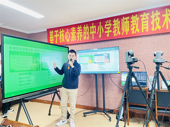 長興縣教育信息技術中心周潔和王俊軍老師以講座、研討、案例分析等形式,介紹了基礎教育精品課的相關要求、標準,錄制精品課所需硬件設備和使用綠幕+摳像軟件錄制精品課的技術要求和制作方法。王俊軍老師帶領參訓學員現場選取素材,分組完成作品,并現場進行點評。