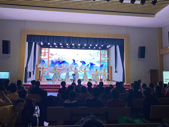 在閃爍的燈光與古典樂曲的配合下,諸暨市楓橋鎮(zhèn)楓之韻藝術(shù)團的演員們身著青綠裙裝,婀娜的舞姿,明快的節(jié)奏,熟練的動作瞬間點燃開場氣氛,觀眾們紛紛拿出手機拍下《出水蓮》的一幀幀畫面。越劇《金玉良緣》那熟悉的旋律,明白的臺詞,以及演員圓潤的唱腔、規(guī)整的扮演,一招一式都迎合著觀眾的心,大家合著樂曲唱起來。廣場舞、印度舞、旗袍秀……一個個節(jié)目依序上演,今年獲得諸暨市“夢想諸暨”才藝達人秀金獎節(jié)目的舞蹈《昨天小樓又東風(fēng)》隆重登場,觀眾連連鼓掌稱好,大家沉浸在演員熟練的演技、激情的演出中。幸福的時刻總是短暫的,熟悉的樂曲響起,全體演員合唱《我和我的祖國》共同祝福祖國帶來美好的生活,晚會至此結(jié)束。
