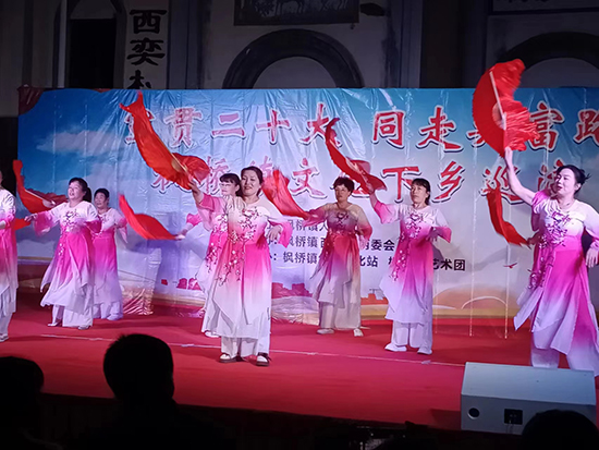 日前,諸暨市楓橋鎮(zhèn)西奕村廣場(chǎng)上熱鬧非凡,魏氏家廟門(mén)口搭起的舞臺(tái)裝飾一新,“‘宣貫二十大 共走共富路’楓橋鎮(zhèn)文化下鄉(xiāng)巡演”在此舉行。廣場(chǎng)舞、歌曲等不同類(lèi)型的節(jié)目輪番上演,帶給村民無(wú)窮的樂(lè)趣。