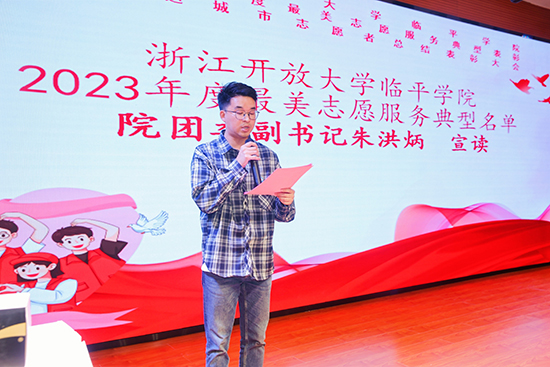 院團(tuán)委副書記、志愿服務(wù)隊(duì)負(fù)責(zé)老師朱洪炳宣讀2023年度最美志愿服務(wù)典型名單