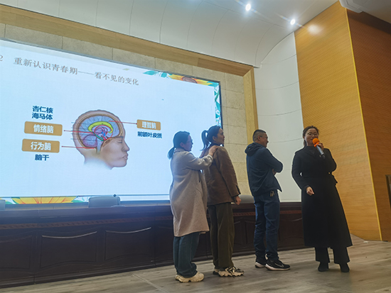 丁姬概括了青春期孩子“叛逆、自我、不聽話、犟……”的性格特征。家長們紛紛點頭稱是。丁姬從“身體成長、生理機能發育、性的發育和成熟、情緒變化、社交變化、學習變化”等六方面介紹青春期孩子外形“看得見的變化”;又分“情緒腦、行為腦、理智腦”等三方面內在的“看不見的變化”。家長重點關注的是看不見的變化,概念有些深奧難懂,在圖像展示與生動描述下,最終明白了“杏仁核、海馬體”等是什么東東,露出了會心的笑。