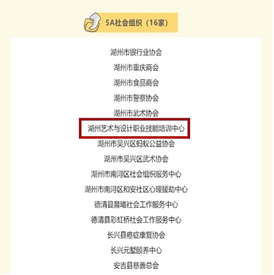 根據《湖州市民政局關于做好社會組織評估工作的通知》(湖民社通〔2023〕3號),通過社會組織自評、業務主管單位初審、第三方評估機構實地考察評估,經審核、公示,確定湖州藝術與設計職業技能培訓中心再次評定為湖州市5A社會組織。