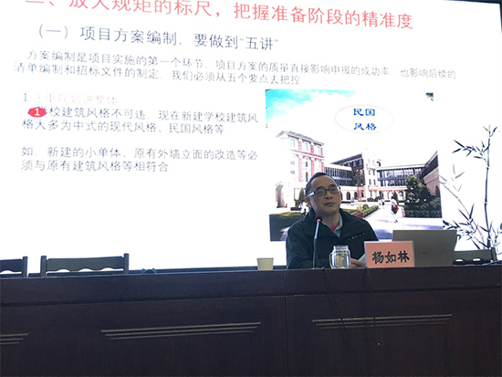 湖州教育發展有限公司黨支部書記、總經理楊如林以《說說學校維修改造項目管理的規矩》為題作專題講座,他通過實例細說學校維修改造項目各個階段的基本程序,強調做到“六個到位”,還從項目編制、服務單位遴選、合同審核、清單編制、開工準備、施工現場、竣工驗收、結算審計、資料歸檔等方面來闡述后勤基建中的一些典型問題和處理方法,為學員明確了學校維修改造項目管理的“規矩”。