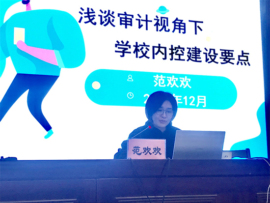 長興縣審計局財政審計科科長范歡歡以《淺談審計視角下學校內控建設要點》為題作專題講座,她從審計的概念與認識、內控的概念與認識、內控的主要步驟和流程、內控案例學習分析四方面來闡述。通過內控的典型案例,為大家解析了學校后勤管理可能存在的盲點和風險點,強調了各個學校完善內控制度的重要性。