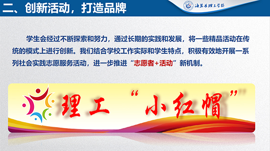 該校學生會通過長期的實踐和發展,將一些精品活動在傳統的模式上進行創新。結合學校工作實際和學生特點,積極有效地開展一系列社會實踐志愿服務活動,進一步推進“志愿者+活動”新機制。