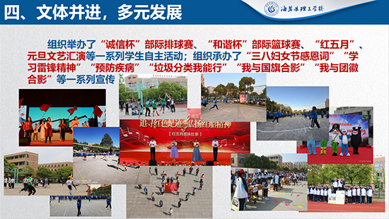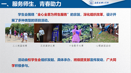 該校學生會組織舉辦“誠信杯”部際排球賽、“紅五月”、元旦文藝匯演等一系列學生自主活動;組織承辦“三八婦女節感恩詞”“學習雷鋒精神”“垃圾分類我能行”“我與團徽合影”等一系列宣傳,不僅鍛煉了學生自己的實踐能力,更為學校宣傳做出了貢獻。