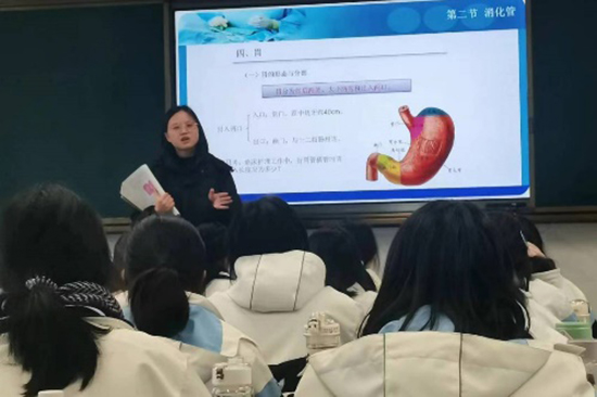 你認識自己的胃嗎?康養(yǎng)休閑旅游服務專業(yè)教師李雪帶學生走進消化系統(tǒng)的重要器官“胃”的世界。課堂通過講授、找茬、師生互動等方式突破重難點,并利用多媒體,使用“3D body”軟件投屏,激發(fā)學生學習興趣。誰說書本上的知識是死的?李老師將教材上的二維圖畫動起來,讓原本枯燥晦澀的解剖課堂變得生動有趣,大大提升學生對知識點的掌握能力。