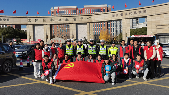 12月1日周五放學開展一次“警校共建齊聚力 交通安全伴我行”為主題交通安全勸導活動。富陽交警大隊銀湖中隊交警身著警服,充分發揮了“護學崗”機制作用,組織學校、志愿者、黨員教師共同維護好交通秩序和治安秩序,緩解交通壓力,引導市民自覺遵守交通規則,摒棄不文明交通行為構建校園周邊安全區域。為進一步增強廣大師生的交通安全意識,營造綠色、文明、安全的交通秩序。學校旅游文秘支部的黨員教師和學生會志愿者也積極參與本次的交通安全勸導活動。黨員教師和志愿者們都身著紅馬甲,在校園南門、高遠路、高科路等人車密集路口和人行道展開交通安全勸導志愿服務活動。