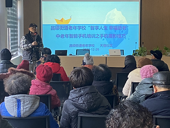 為讓轄區(qū)內(nèi)的老年人更好地學(xué)習(xí)手機(jī)攝影技巧,豐富老年業(yè)余精神文化生活,12月26日下午,安吉縣社區(qū)教育學(xué)院昌碩分院在天目社區(qū)舉辦“智享人生 幸福助老”老年人手機(jī)攝影技巧培訓(xùn)活動(dòng)。來自天目社區(qū)的50余位老年人參加培訓(xùn)。
