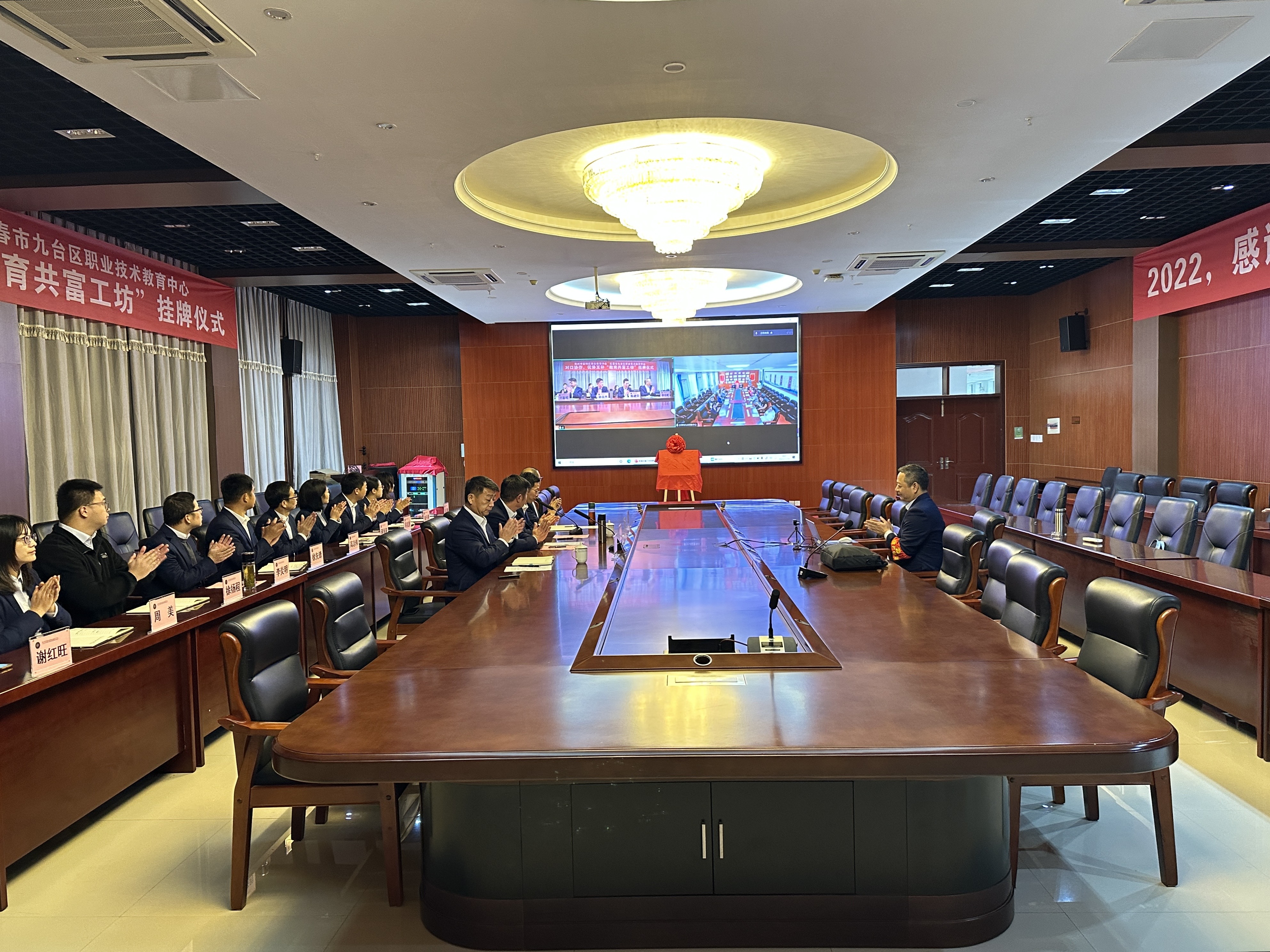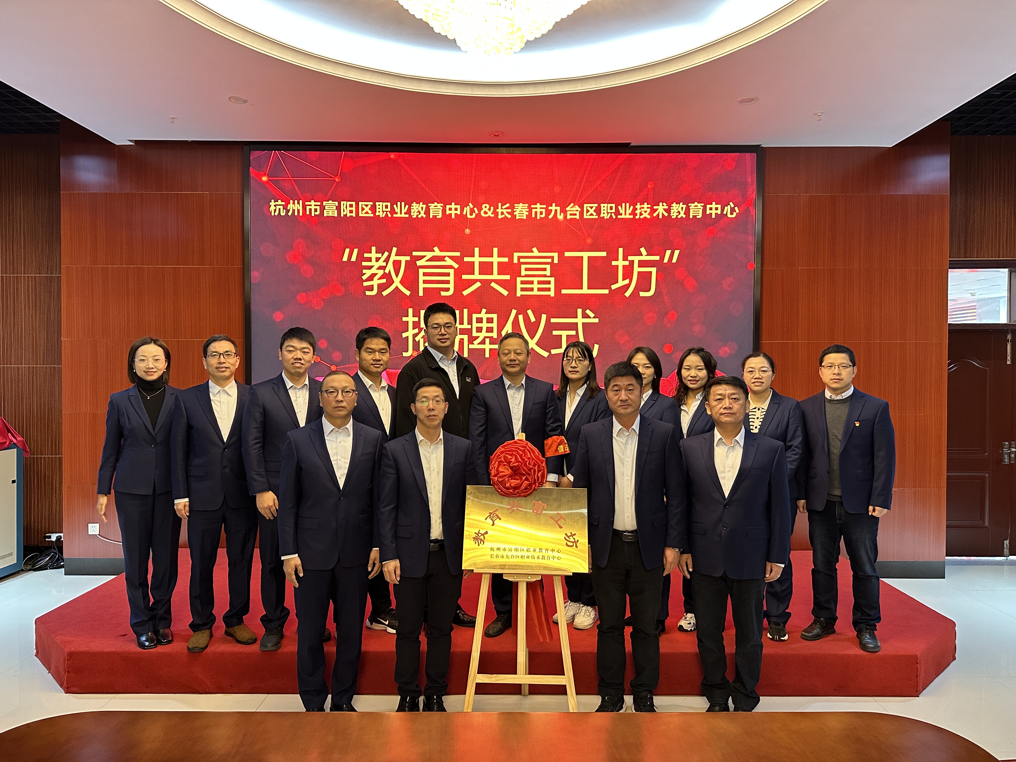 富陽區(qū)職業(yè)教育中心校長孫良杰宣讀雙方合作協(xié)議。九臺區(qū)職業(yè)教育中心副校長尹旭光從學校的地理位置、歷史沿革、辦學情況、師資力量、專業(yè)設(shè)置、技能大賽、所獲榮譽等方面詳細介紹學校的基本概況。富陽區(qū)職業(yè)教育中心副校長劉著程作題為“第一技能,陽光賦能”專題匯報,從學校概況、生源狀況、辦學過程中形成的特色及技能大賽等方面詳細闡述學校“第一技能”德育品牌管理模式和成果。最后,富陽區(qū)職業(yè)教育中心校長孫良杰與九臺區(qū)職業(yè)技術(shù)教育中心校長楊紹山共同為“教育共富工坊”揭牌,在座的各位領(lǐng)導(dǎo)和來賓共同見證了這一時刻。