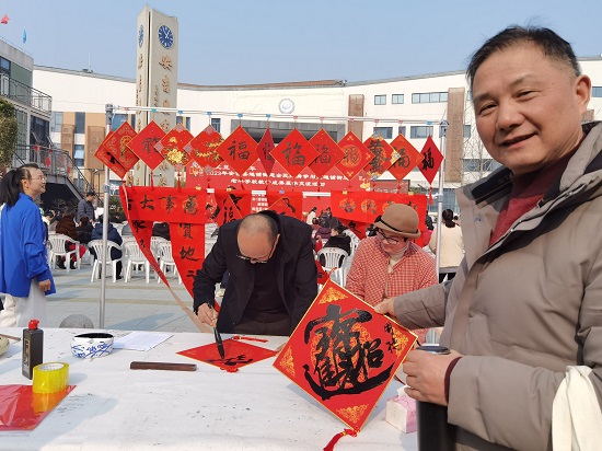 何吉豐校長陪同眾多領(lǐng)導(dǎo)和嘉賓參觀了學(xué)校和村社區(qū)活動成果展板,并到花藝、茶藝、書畫、烘焙四個項目展臺體驗。看到學(xué)員們和老百姓有序排隊領(lǐng)取福字和對聯(lián),品嘗蛋撻和餅干,各位領(lǐng)導(dǎo)們對本次活動的成功開展充滿期待。