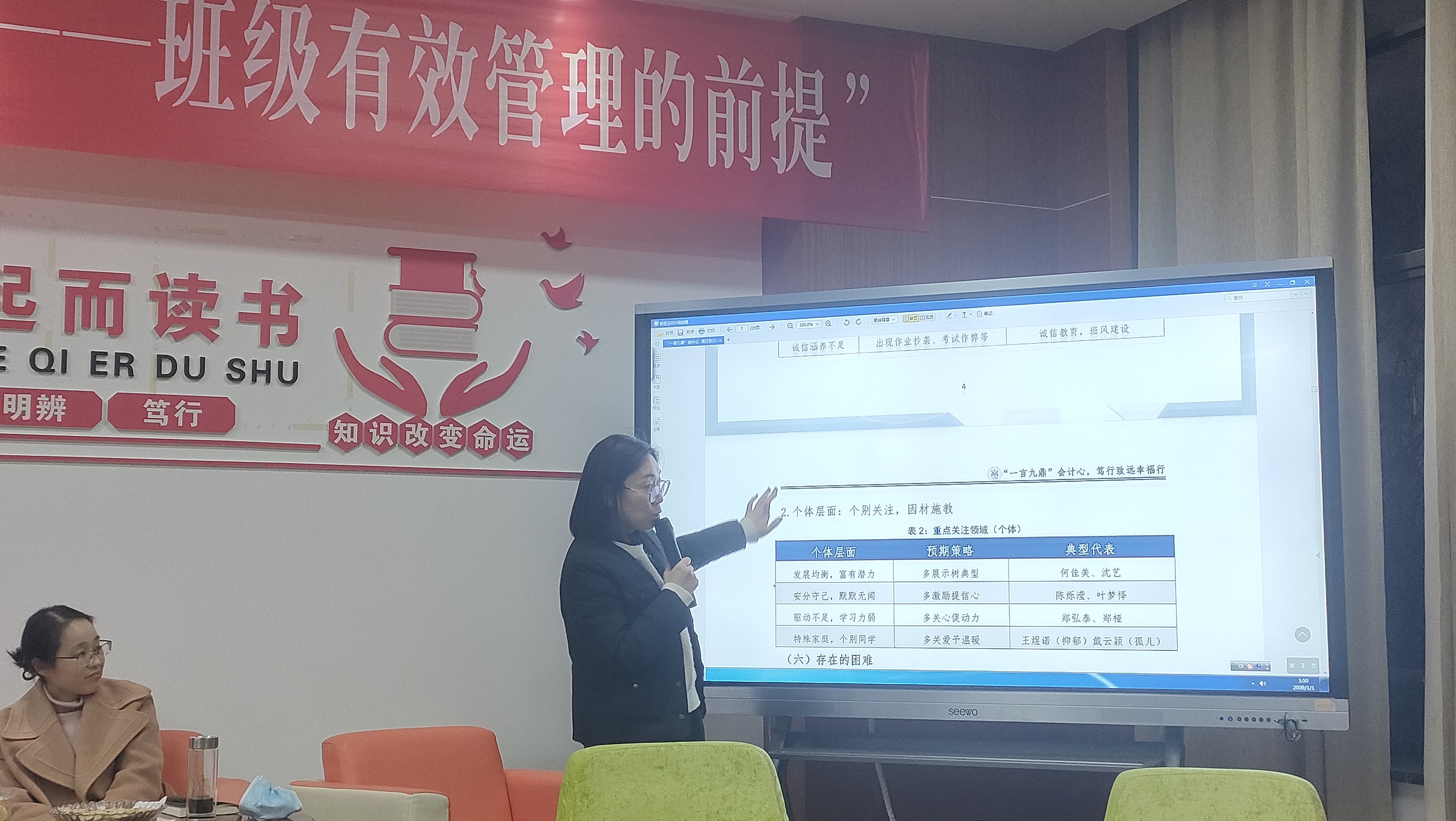 第二項議程,由校班主任競賽團隊成員之一顧祝燕老師分享班建方案中班情分析的具體做法,她從“班級概況(分維度)、專業特點、學生特點、發展訴求、重點關注領域和個體、可能要面臨和需要解決的問題”六個方面,多個維度,從學生的入校的身心基礎到畢業后的可持續性發展全面系統分析,從理論到具體的數據,動態模擬三年班情,直觀呈現了她的成果。活動中,學校工會主席劉杰雨老師還跟老師們分享了他當年做班主任時如何分析班級情況,如何三年跟蹤班上每一個同學的三年學校生活,記錄他們的三年變化和成長。在場的班主任都佩服劉老師的工作的創新和韌性。