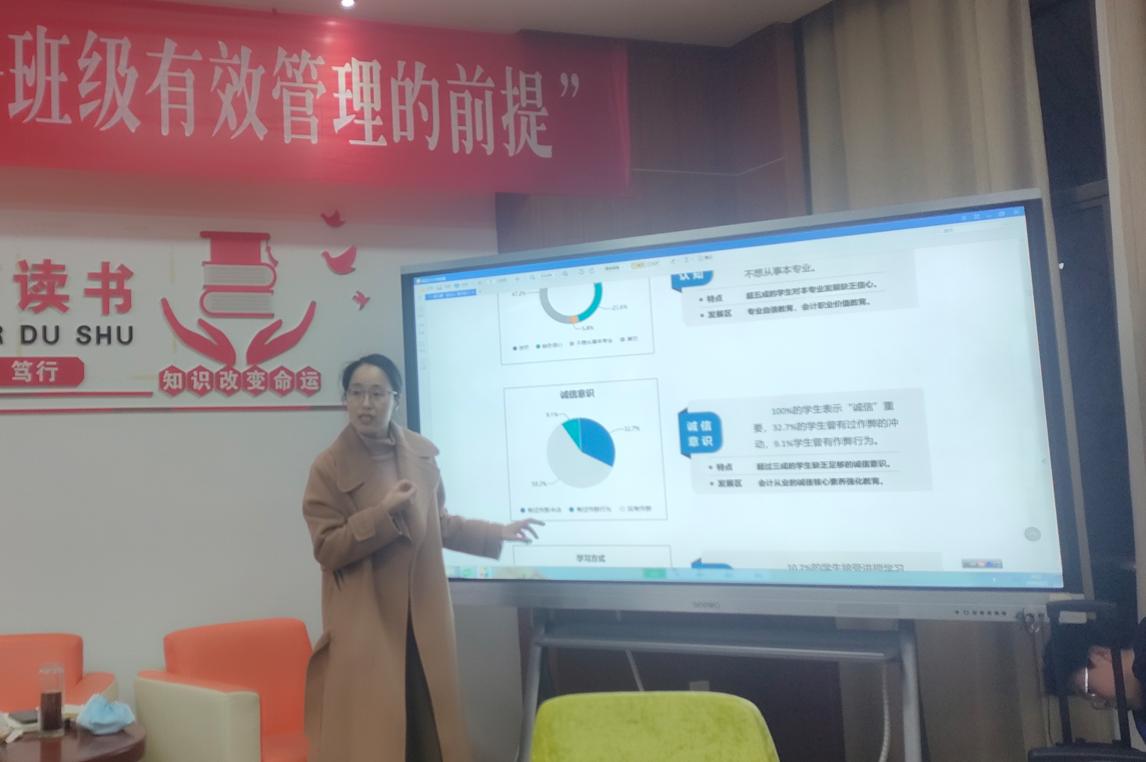 活動伊始,由新班主任各自交流自己班級的情況以及自己對不同班情的具體做法。交流中,23計算機大專班的張聰俐老師從班級的男女生比例、入學成績、月考和期中考前后成績以及學生的表現分析了班級的實際情況,分享了在班級管理中的做法,同時也向老班主任們提出了“如何應對班級數學成績嚴重下滑”的問題。22國商高考班董泓璐老師交流了處理班級女生小團體問題的摸索過程,也表達了如何更好建立班級新生態的困惑。21關務大專班的俞瑩老師回顧了兩年多來的帶班歷程,在班級管理上她已經積累了一些經驗,然而面對學生已經完成轉段升學考暫無升學壓力的狀況,她也提出了在特殊時期如何管理班級的問題。在本次沙龍上,面對這些看似常見卻又有不同根源的問題,在場的班主任各抒己見,暢談自己的想法或具體做法。